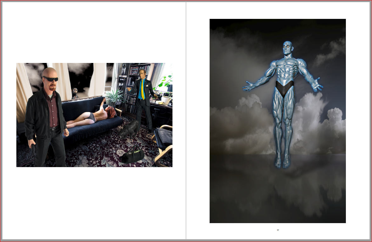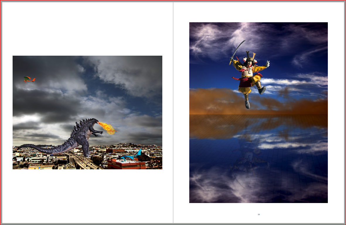 Words and Pictures is a fantasy book that employs action figures in “roles” right out of pop culture or national news but filtered, for clarity, through my imagination. The various components are assembled in Photoshop and often include landscapes and cityscapes from throughout California, Texas, Arizona and Utah as backgrounds to scenes of modern biblical mystery and mayhem, often described by me as prophetic unrealities.