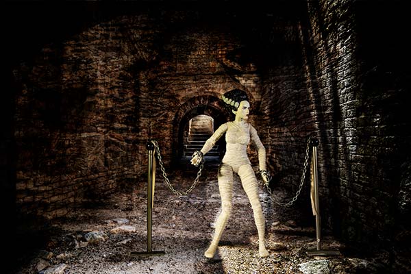 Somehow, she manages to escape her chains and slip on a hospital gown, but the vast underground dungeon beneath Castle Frankenstein is dark and cryptic.